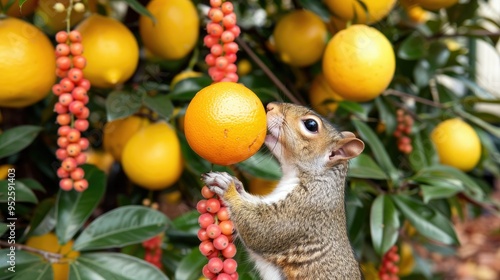 © NAK, Obraz premium A squirrel is eating red berries on the tree
