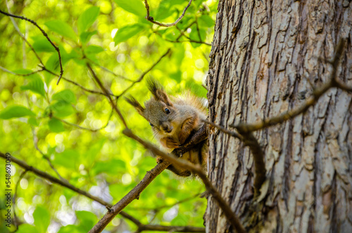 © Сергей Лаврищев, Obraz premium A squirrel is sitting on a tree branch.