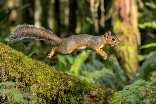 Obraz premium a squirrel leap between tree branches
