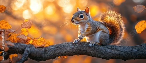 © Almahyra, Fototapeta premium A squirrel on a branch in autumn sunlight.