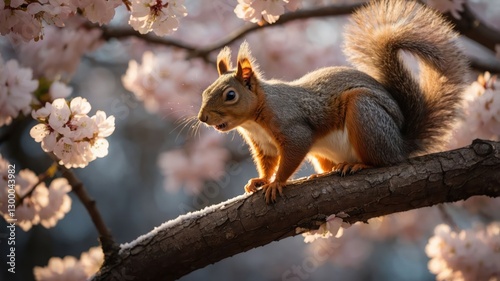 Fototapeta premium A squirrel perched on a branch amidst blooming cherry blossoms, capturing a...