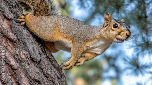 Obraz premium A squirrel perched on a tree trunk, looking up with a curious expression.