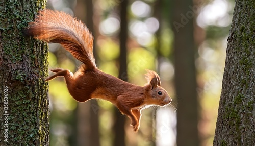 © Portraits, Fototapeta premium A Squirrel's Bold Leap Through the Canopy Captured Mid-Flight
