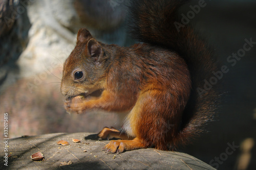 © Dzmitry, Fototapeta premium A squirrel sits on a stone and eats a nut.