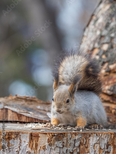© Dmitrii Potashkin, Obraz premium A squirrel sits on a stump and eats nuts in autumn.