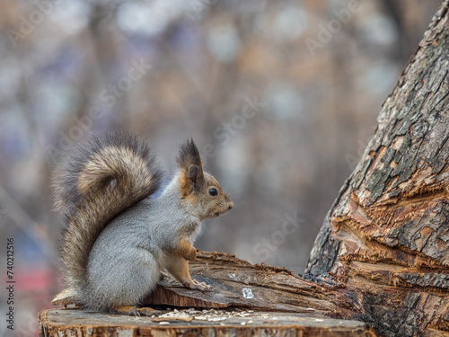 Fototapeta premium A squirrel sits on a stump and eats nuts in autumn.