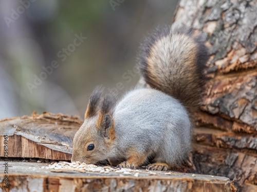 Fototapeta premium A squirrel sits on a stump and eats nuts in autumn.