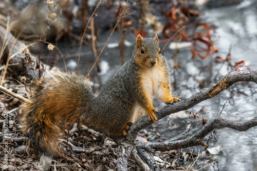 © Wirestock, Fototapeta premium a squirrel that is sitting on some branches in the grass