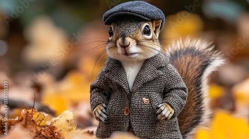 © Amat, Obraz premium A squirrel wearing a hat and coat stands amidst autumn leaves