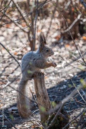 Fototapeta premium A squirrel with a nut sits on a stump in spring or summer.