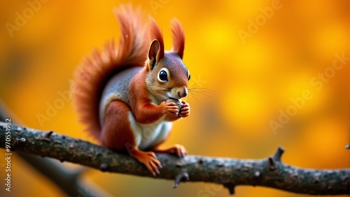 © Antonio, Fototapeta premium A squirrel with a red tail is eating something while sitting on a tree branch