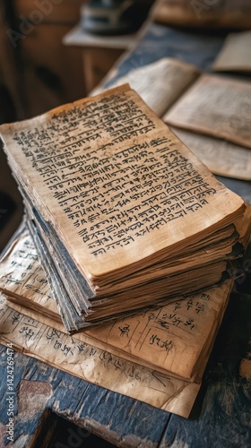 Obraz premium A stack of aged, handwritten books filled with ancient scripts.