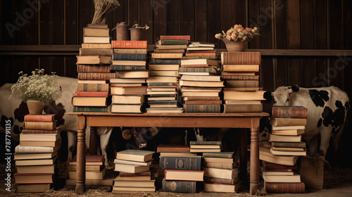 Obraz premium A stack of antique farming books with an open space at the center, inviting typography placement