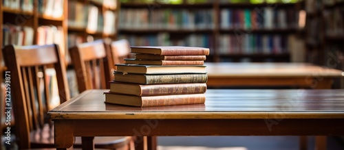Obraz premium A stack of books on a wooden table in a quiet library filled with shelves of...