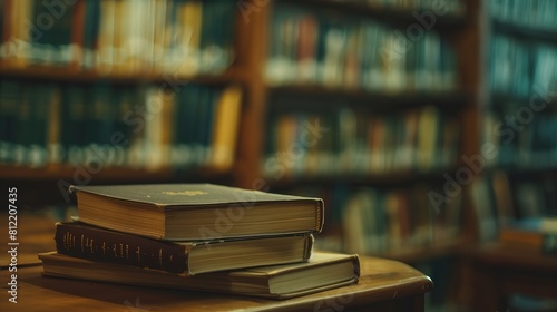 © Elshad Karimov, Fototapeta premium A stack of books rests on a wooden desk in a library room, creating a focal point against a backdrop of a blurred bookshelf