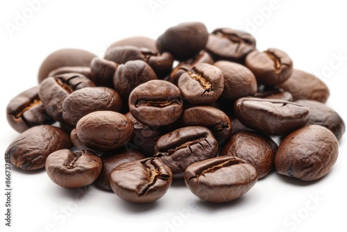 © Fotograf, Naklejka premium A stack of coffee beans on a clean white surface