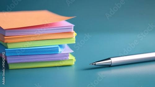 © Mrammon, Fototapeta premium A stack of colorful sticky notes in pastel shades, arranged neatly with a sharp pen beside it