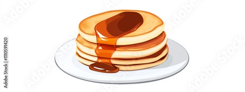 © aubriella, Fototapeta premium A stack of fluffy pancakes with a drizzle of caramel sauce, isolated white background, retro art style