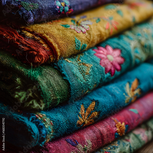 Fototapeta premium A stack of folded embroidered fabrics in various colors.