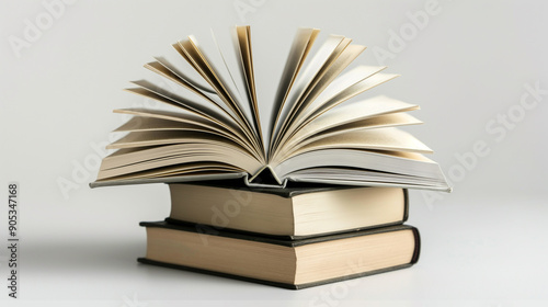 Obraz premium A stack of open books with one flipped open on top, symbolizing knowledge,...