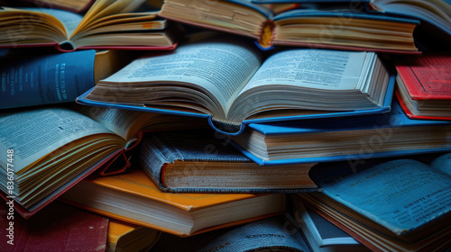 Obraz premium A stack of open textbooks, detailed pages and covers, top view, showcasing...