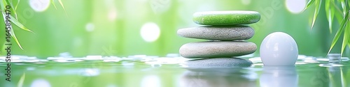 © SJarkCube, Fototapeta premium A stack of rocks and a white ball are on a body of water