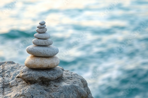 Fototapeta premium A stack of rocks sits atop another rock near the ocean, offering a unique...