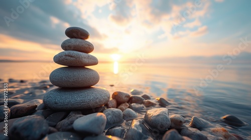 Fototapeta premium A stack of smooth stones balanced on a rocky beach at sunset, with a calm sea...