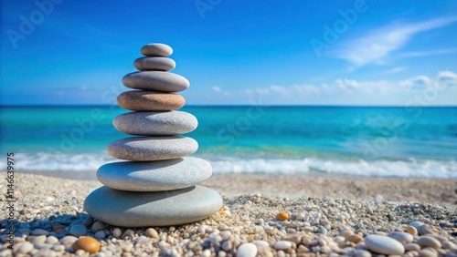 Fototapeta premium A Stack of Smooth Stones on a Sandy Beach with a Blurred Ocean in the Background