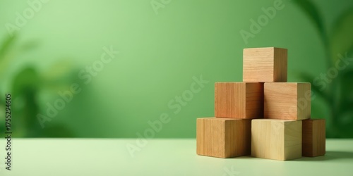 © napak, Obraz premium A Stack of Unfinished Wooden Cubes Against a Verdant Background, Representing Growth and Potential