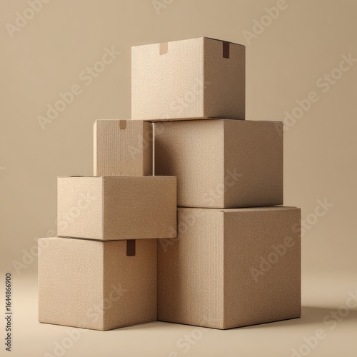 © Scetsa, Obraz premium A stack of various-sized, light brown cardboard boxes, neatly arranged against a beige backdrop, sealed with simple brown tape