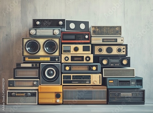 © ma, Obraz premium A stack of vintage audio devices, including cassette tapes and boomboxes, arranged in an artistic display against a concrete wall background.