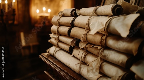 © Rimastudio, Fototapeta premium A stack of weathered aged parchment scrolls tied with string rests on a surface with blurred candle lights in the background
