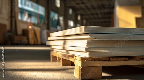 Obraz premium A stack of white rectangular objects rests on a wooden pallet inside a warehouse, bathed in light