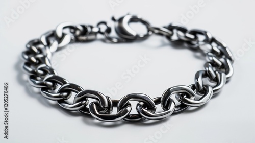 © Hassan, Obraz premium A stainless steel chain bracelet with a masculine design, presented on a white backdrop.