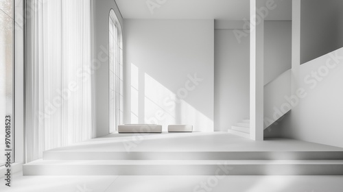 © PhornpimonNutiprapun, Fototapeta premium A staircase in the living room with a minimalist aesthetic.