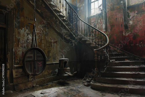 Naklejka premium A staircase with a giant pendulum swinging beside it