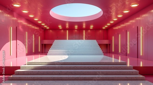 © starush, Obraz premium A stairway leading to a room with pink walls and red carpet, AI