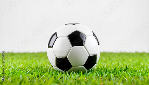 Obraz premium a standard soccer ball with black and white pentagon pattern resting on well-maintained green grass, isolated on neutral background