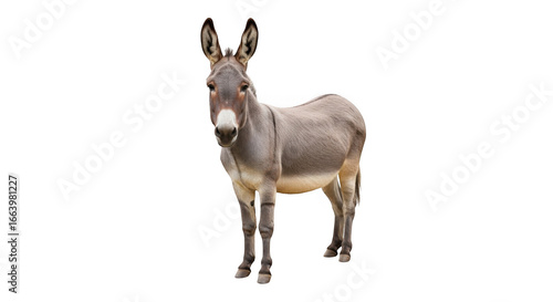 © Demas, Fototapeta premium A standing grey donkey with long ears and dark eyes looking directly at the camera against a black background
