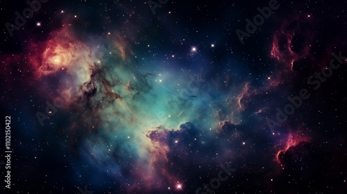 © iAmP, Naklejka premium A starry galaxy with colorful nebulas, backlighting, space on the right,generative ai illustration