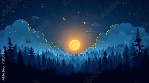© virza, Naklejka premium A starry night forest scene with moon and clouds