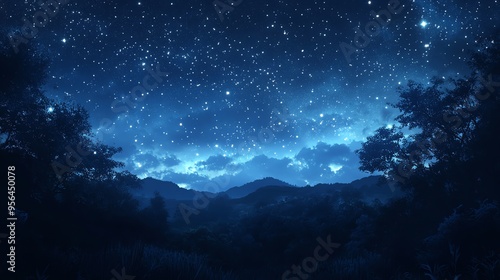 Fototapeta premium A starry night sky over a dark forest and mountains.