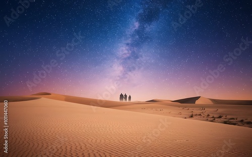 Obraz premium A starry night sky over a desert landscape. The Milky Way Galaxy is visible...