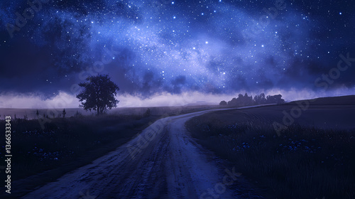 Fototapeta premium A starry night sky over a lonely road, with a gentle mist shrouding the...