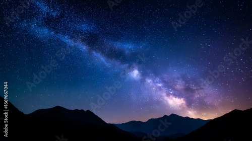 © Wang, Naklejka premium A starry night sky over silhouetted mountains.