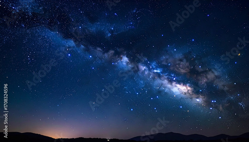 © Teeraphat, Fototapeta premium A starry night sky with bright stars, clouds, and a faint nebula, illuminating the dark universe