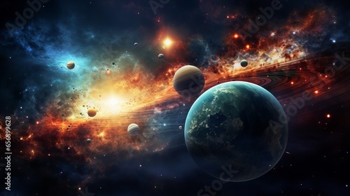 Obraz premium A starry sky and a solar system: a sunrise over a group of planets in outer...