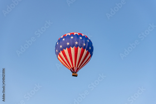 © Rose Guinther, Fototapeta premium A stars and stripe hot air balloon flying high in the blue sky.
