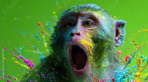 © Suwandi, Fototapeta premium A startled macaque covered in bright paint splashes poses before a neon-green background. Energetic